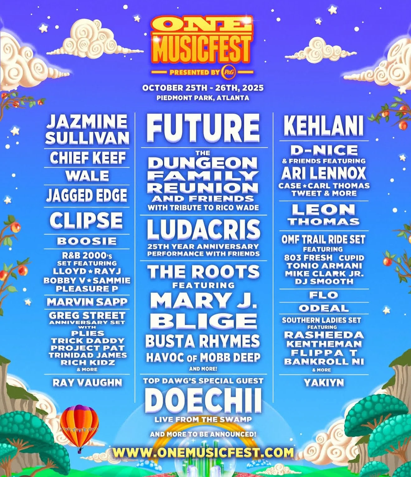 Live Nation Urban announces ONEMUSICFEST 2025 Lineup featuring headlining Artsits Future, The Dungeon Family Reunion and Friends with Tribute to Rico Wade, Ludacris and more. ONEMUSICFEST always feel like a Family Reunion in Atlanta, Georgia. 2024 was so amazing with the tickets being sold out fans travel from all over the US and other countries to be apart of the culture filled festival. From live music performances to the wonderful activations P & G provides such as Charman, Mielle, and let’s not forget about the food let’s take a look back on our coverage from last year see below for more information as well.